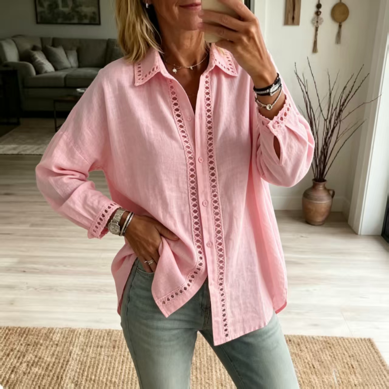 Blush Pink Eyelet Embroidered Linen Oversized Shirt