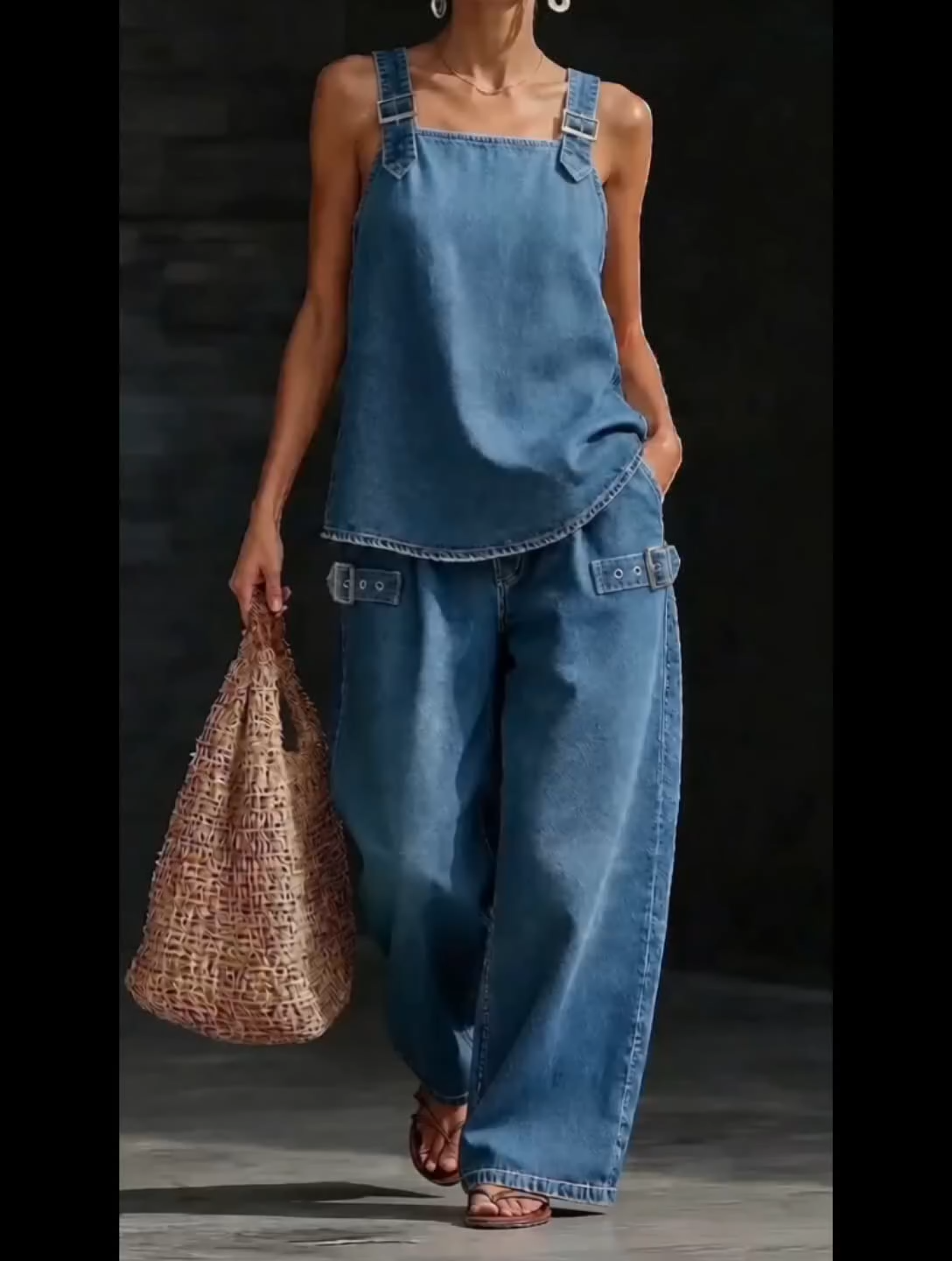 Women's Casual Denim Set: Square-neck Sleeveless Loose-fit Top & High-waisted Wide-leg Pants