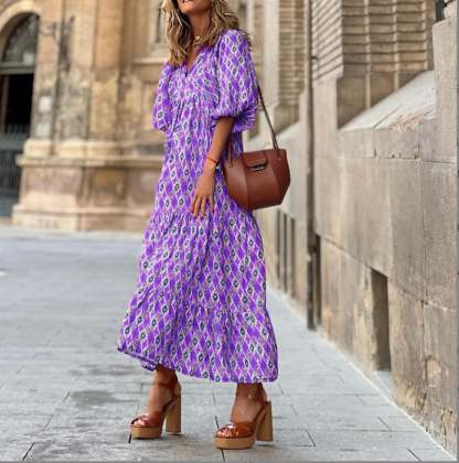 This women's bohemian long dress offers a comfortable and relaxed fit with its classic high-waisted loose fit, V-neckline and ankle-length.